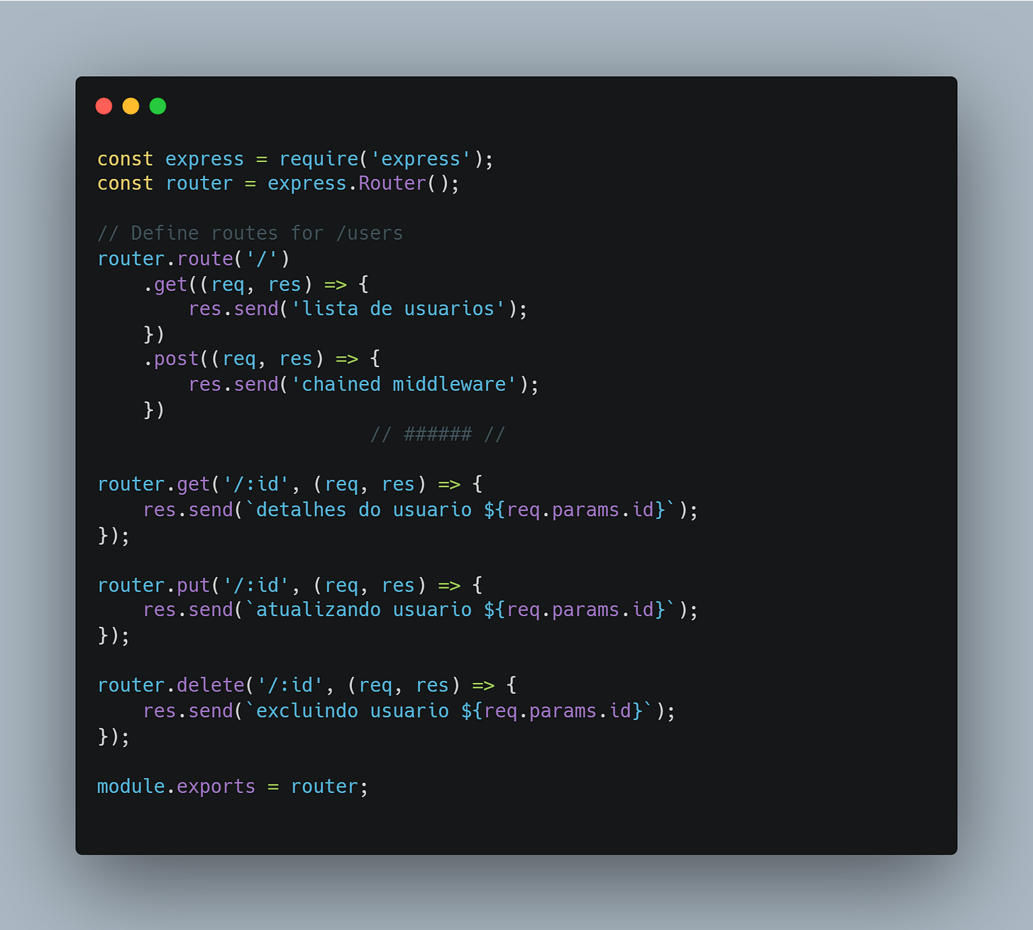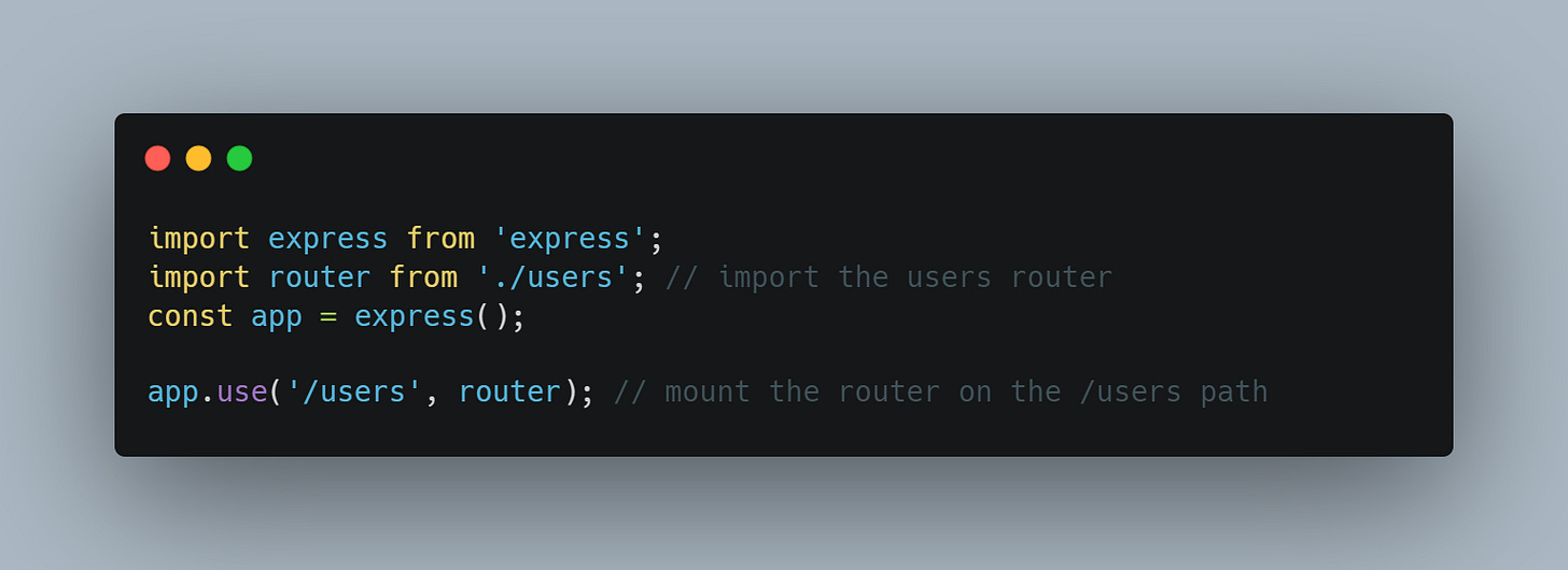 on another file, express.router( ) is called instead of app. At this point the middlewares mechanisms will work on the same way. The only difference is that when importing to the main file, the code will be more organized