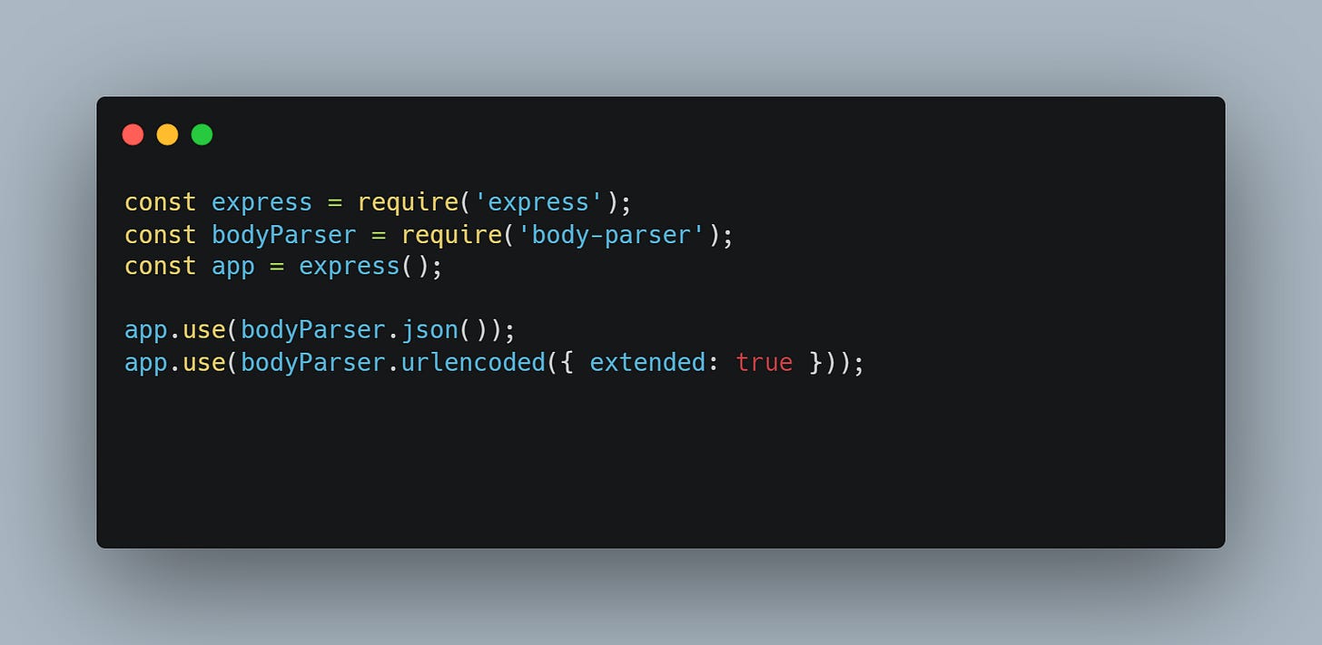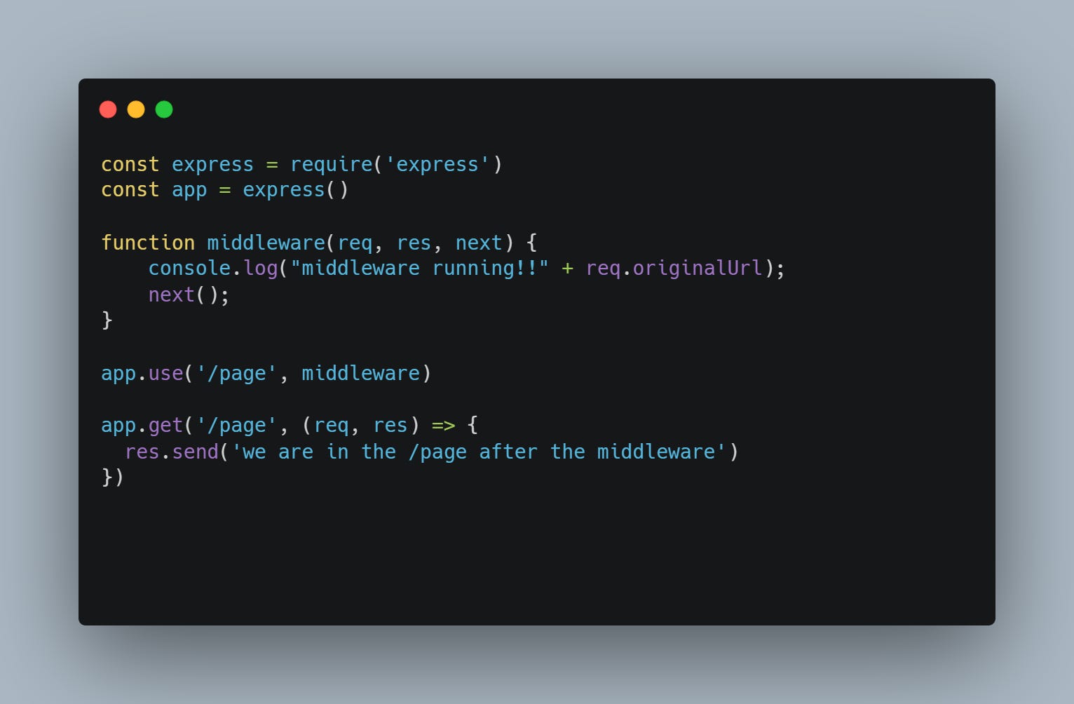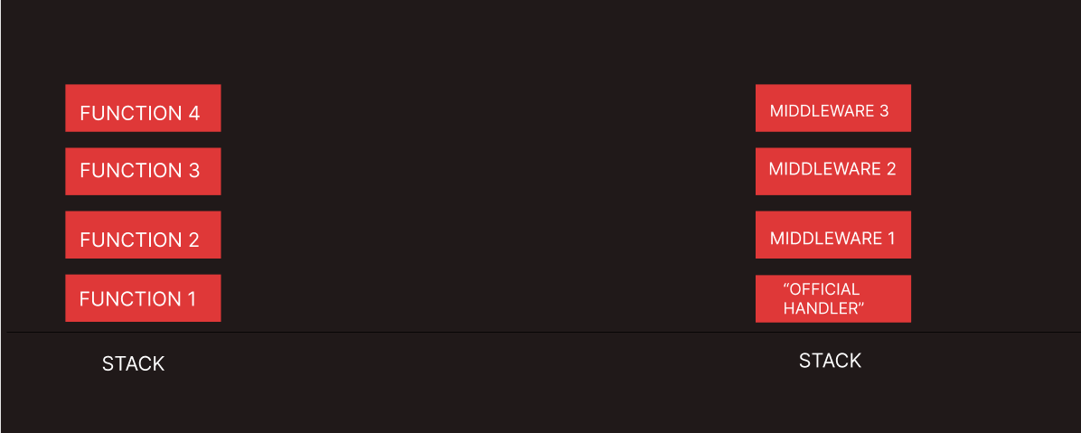 In the body of a middleware that is another function called Next( ), that passes the control to the next middleware on the stack. So if my “offical handler” it’s responsible to send out the request, and “middleware 1” does not call “next( )” the request will be left hanging and the response will not be sent.